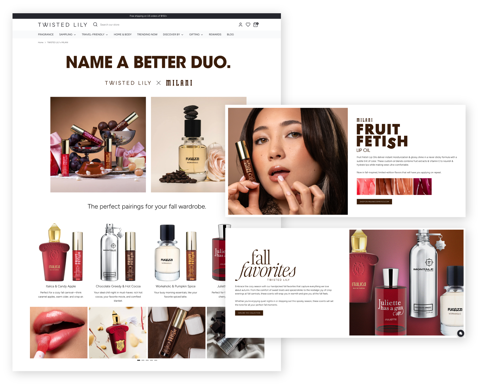 To celebrate this love, Milani and Twisted Lily joined forces to create the perfect fall pairings—Twisted Lily’s most coveted autumn scents matched with Milani’s new Fruit Fetish Lip Oils. To sweeten the deal, both brands offered exclusive discounts on fall favorites and more.